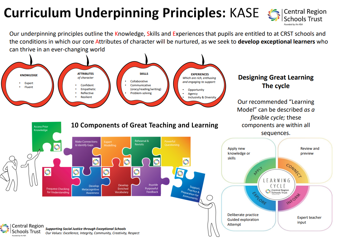 Co- Design at Central Region Schools Trust is about the power of collaboration; creating space for subject expert talk and opportunities to share. Co-Design Teams are led by SLEs and Lead Practitioners who co-design curriculum: the teams collaborate, co-plan, share, moderate and support subject focused expert CPD including designing summer term subject- focused conferences. Co-design Teams provide network groups not only to co-plan but to support subject leadership, so people do not work in isolation. SEN, CPD, Digital Learning, PSHE, T&L, Safeguarding, Behaviour, Attendance, Reading, Mental Health & Well-Being and Disadvantaged/Vulnerable groups are cross phase to develop expertise and knowledge across stages and phases.